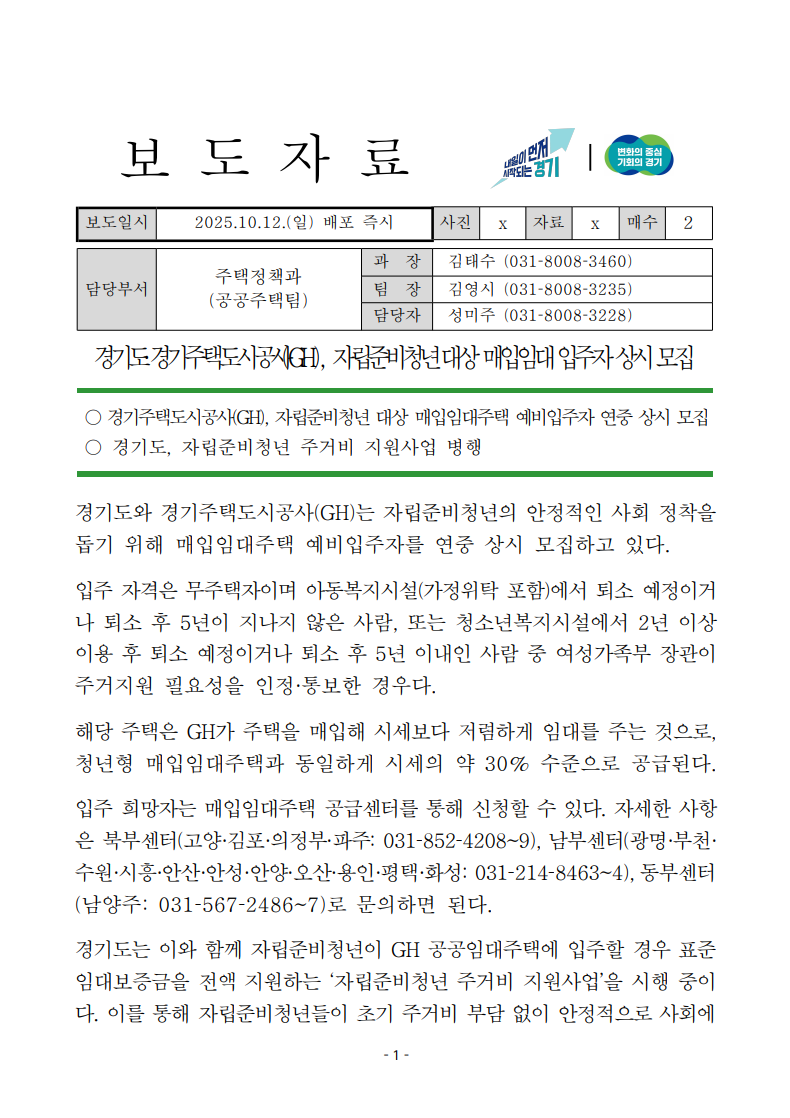 · 경기도·경기주택도시공사(GH), 자립준비청년 대상 매입임대 입주자 상시 모집 분류 : 주택정책 ( 경기도 보도자료 주택정책과 : 2025-10-13 ) |