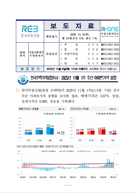 · 주간아파트가격동향 (2025.11.03기준) 분류 : 주택정책 ( 한국부동산원 주택통계부 : 2025-11-07 ) |