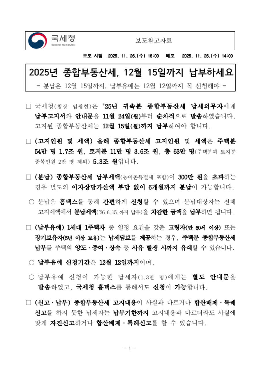 · 2025년 종합부동산세, 12월 15일까지 납부하세요