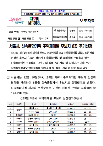 · 서울시, 신속통합기획 주택재개발 후보지 8곳 추가선정 분류 : 주거정책 ( 서울시 보도자료 주거정비과 : 2025-12-18 ) |