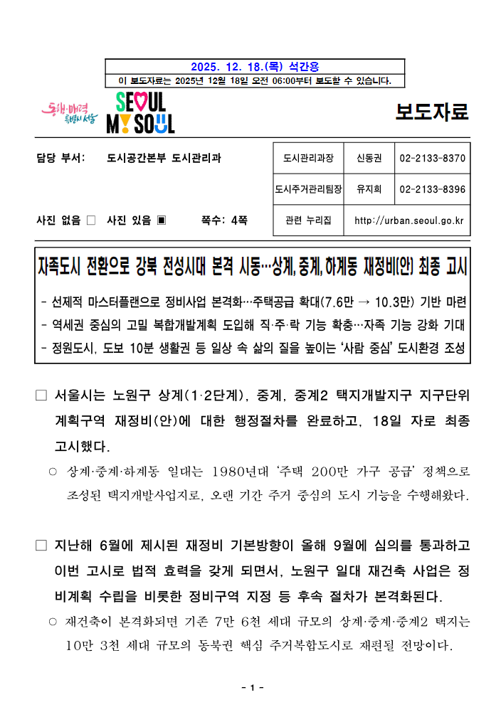 · 자족도시 전환으로 강북 전성시대 본격 시동…상계,중계,하계동 재정비(안) 최종 고시 분류 : 기타정책 ( 서울도시계획포털 도시관리과 : 2025-12-23 ) |