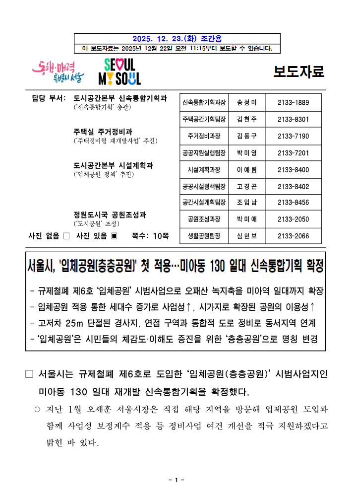 · 서울시, `입체공원(층층공원)` 첫 적용…미아동 130 일대 신속통합기획 확정 분류 : 기타정책 ( 서울시 보도자료 신속통합기획과 : 2025-12-24 ) |