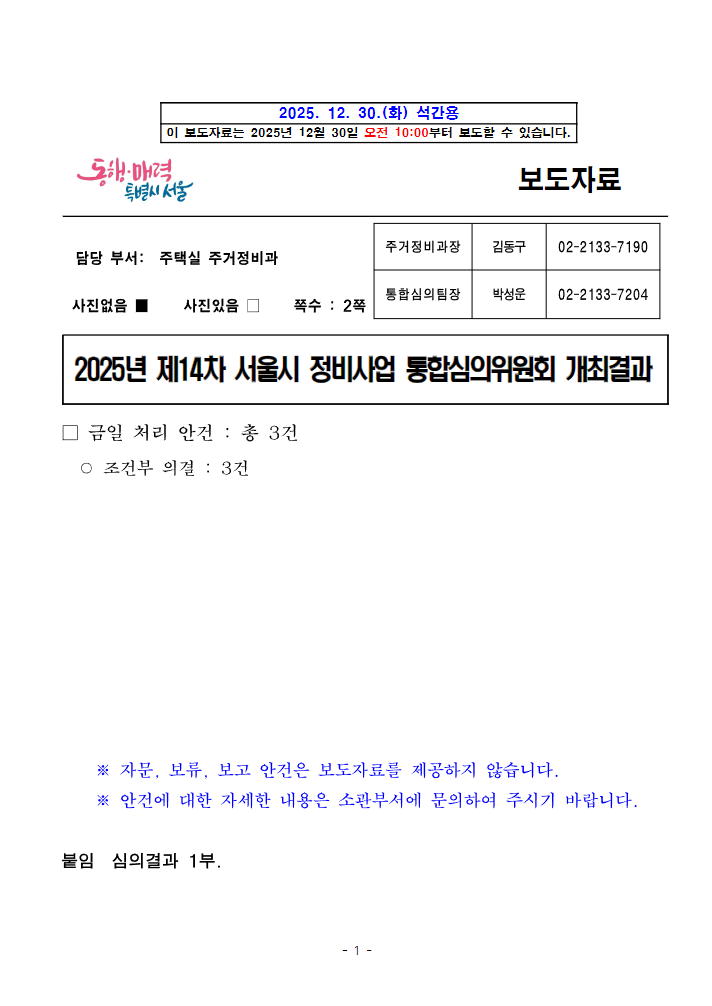 · 제14차 정비사업 통합심의위원회 개최결과 분류 : 주거정책 ( 서울시 보도자료 주거정비과 : 2025-12-31 ) |