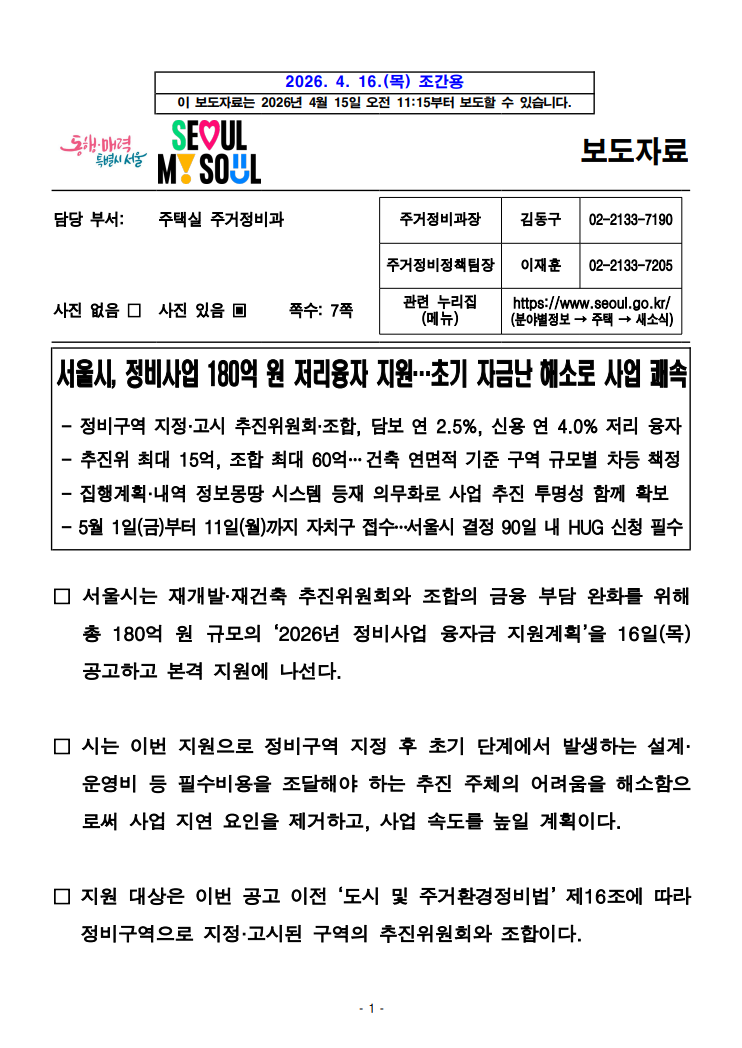 · 서울시, 정비사업 180억 원 저리융자 지원…초기 자금난 해소로 사업 쾌속 분류 : 주거정책 ( 서울시 보도자료 주거정비과 : 2026-04-16 ) |