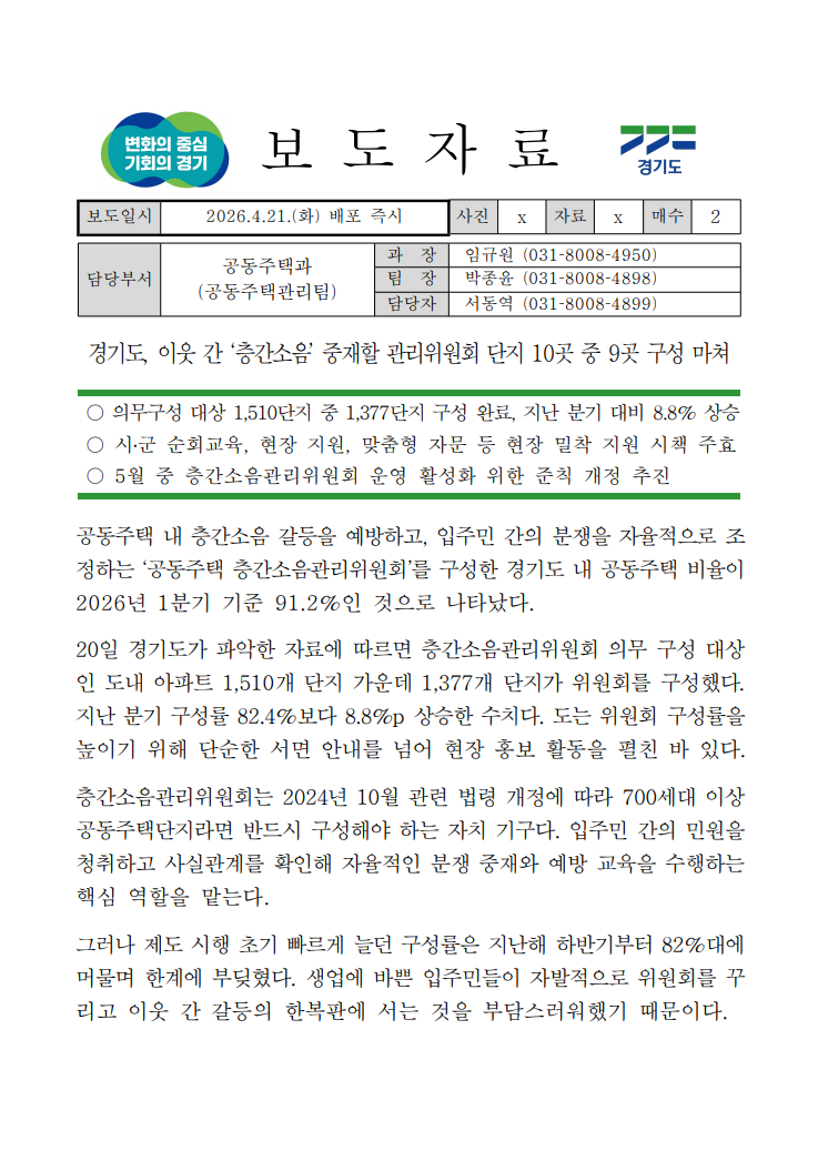 · 경기도, 이웃 간 ‘층간소음’ 중재할 관리위원회 단지 10곳 중 9곳 구성 마쳐 분류 : 주택정책 ( 경기도 보도자료 공동주택과 : 2026-04-22 ) |