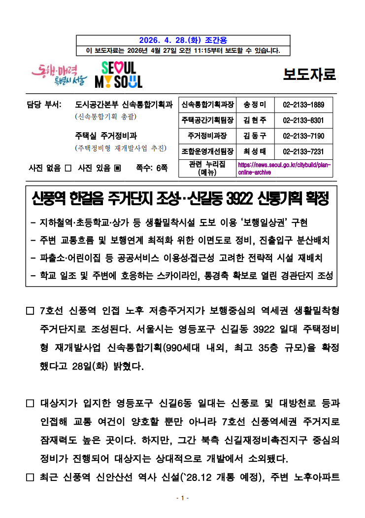 · `06년부터 시작된 신림재정비촉진지구 '신속통합기획'으로 대장정 마침표 분류 : 기타정책 ( 서울시 보도자료 신속통합기획과 : 2026-04-27 ) |